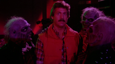 Moorhouse (John Martin) quoting Whitman and Emerson, trying to engage his students in debate, his attempts are wasted in the face of their indifference, Farnsworth (Ken Swofford) similarly disinterested in the warning signs despite bodies piling up in his small town and declining to initiate an investigation and the blown-dry hair of pouting lead singer Damien (Sal Viviano, voiced by King Cobra’s Mark Free, later Marcie Free) far from threatening.