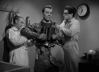 Starring American Howard Duff as Stephen Mitchell and Hungarian-British Eva Bartok as Lisa Frank and released four years before Sputnik was launched and a decade before Kennedy would accelerate the Space Race, it was perhaps reasoned that an international cast would expand the the appeal of what was then a niche interest, and while the matte paintings of both the rocket and the base are convincing the action shots are stock footage with only occasional model work, the majority of the film taking place in mission control or administrative offices.
