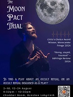 Rotating through the characters and the tangled story of the creative and black arts, Mitchelson presents a show ambitious for the basic space, his energy and emotions shifting as challenges rise, conflicts of interest and concerns over strange coincidences with the even stranger woman he meets in the theatre bar, the physicality of his performance compensating for a voice which is sometimes almost lost as he burns his way through The Moon Pact Trial of demonic orgies and dancing with the damned.